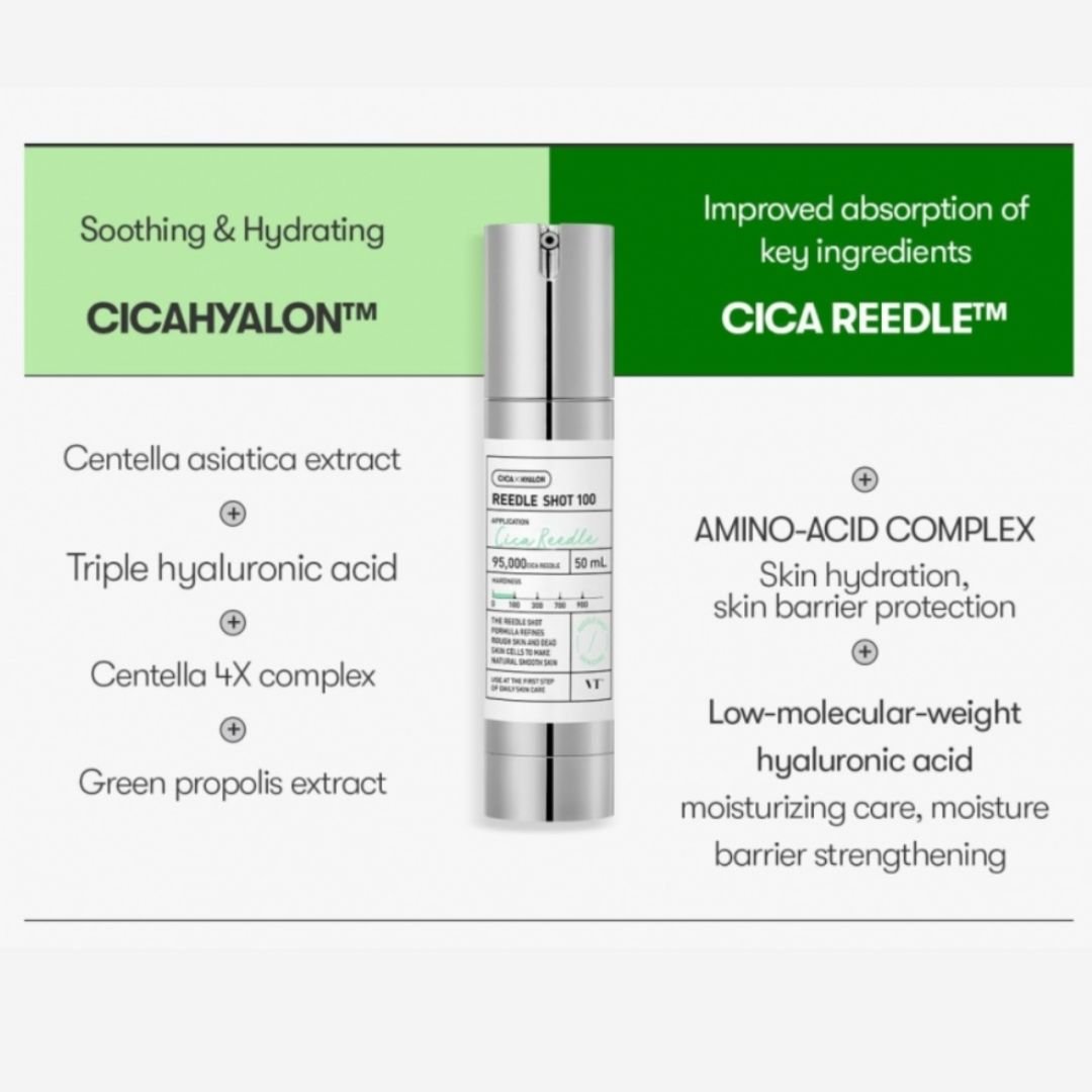 VT Reedle Shot 100 Essence is a next-generation skin renewal solution powered by VT’s signature CICA Reedle™ technology. This lightweight, highly effective essence helps to smooth skin texture, boost cell turnover, and deliver visible radiance — all without irritation.